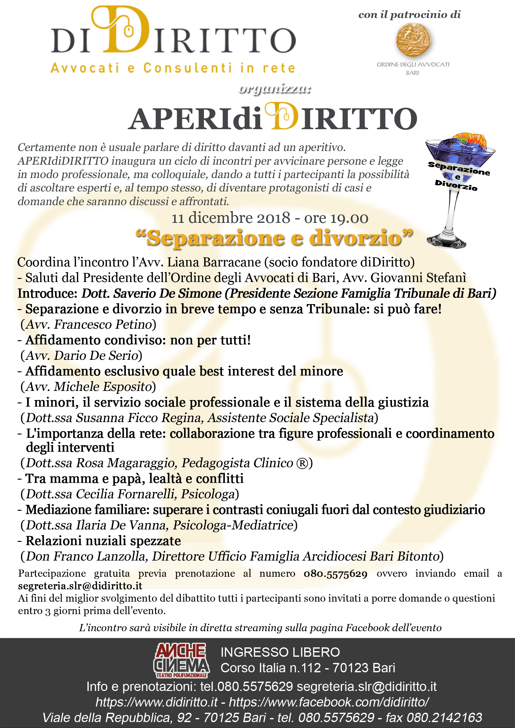 Partecipazione gratuita previa prenotazione al numero 080.5575629 ovvero inviando email a segreteria.slr@didiritto.it